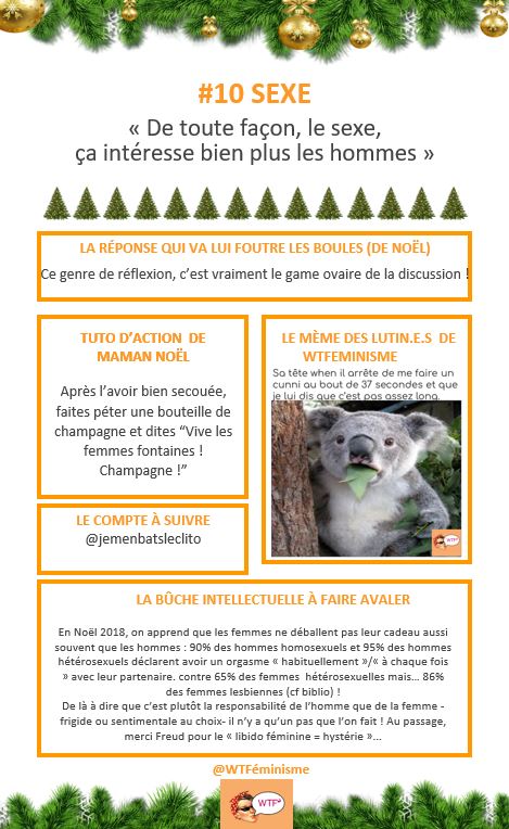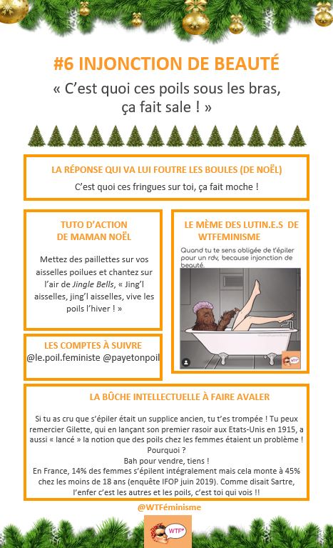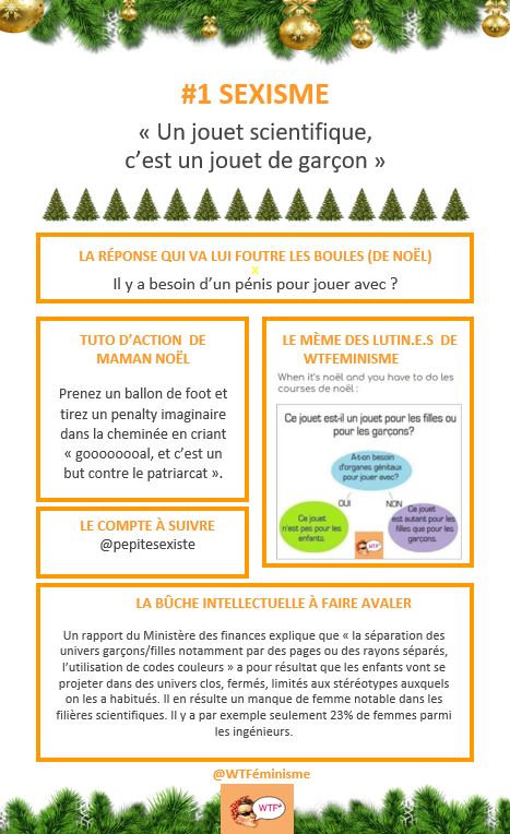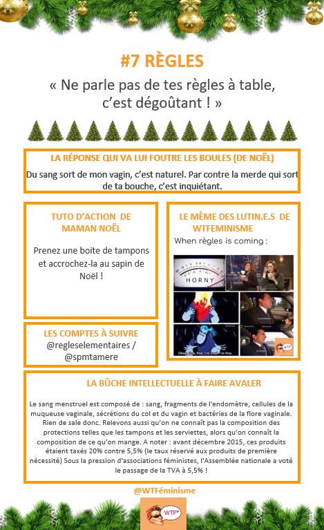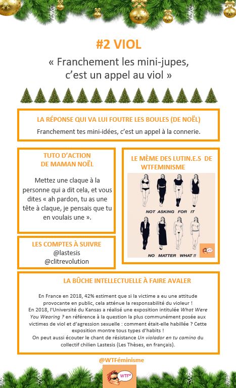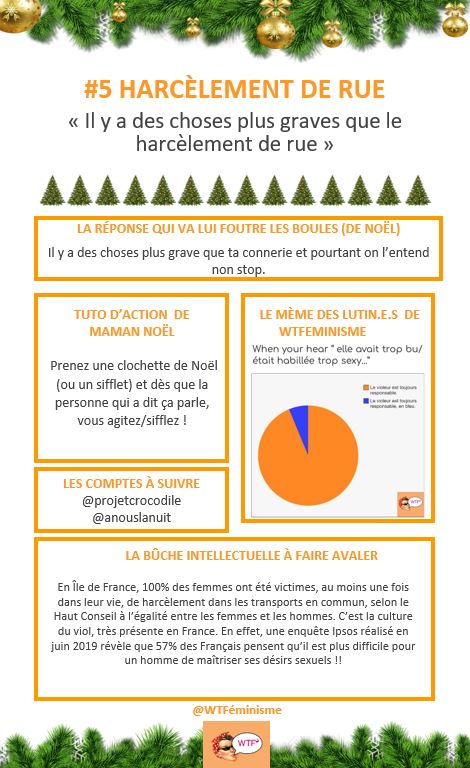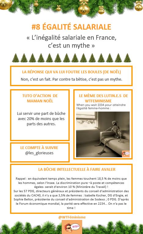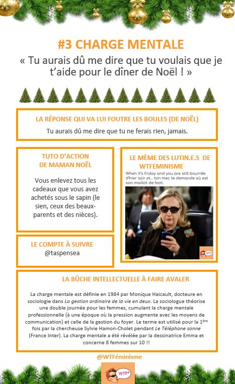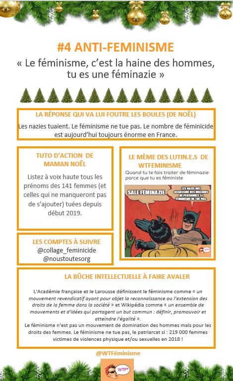 #Noustoutes à également envoyer par mail à ses militantes un petit guide sous forme de QCM pour survivre aux débats familiaux interminables de repas de famille, mais aussi @WTFeminisme qui sur Twitter ( et peut-être d'autres réseaux, j'ai pas vu) à partager des petites images avec des phrases typiques, pour savoir quoi et comment répondre.